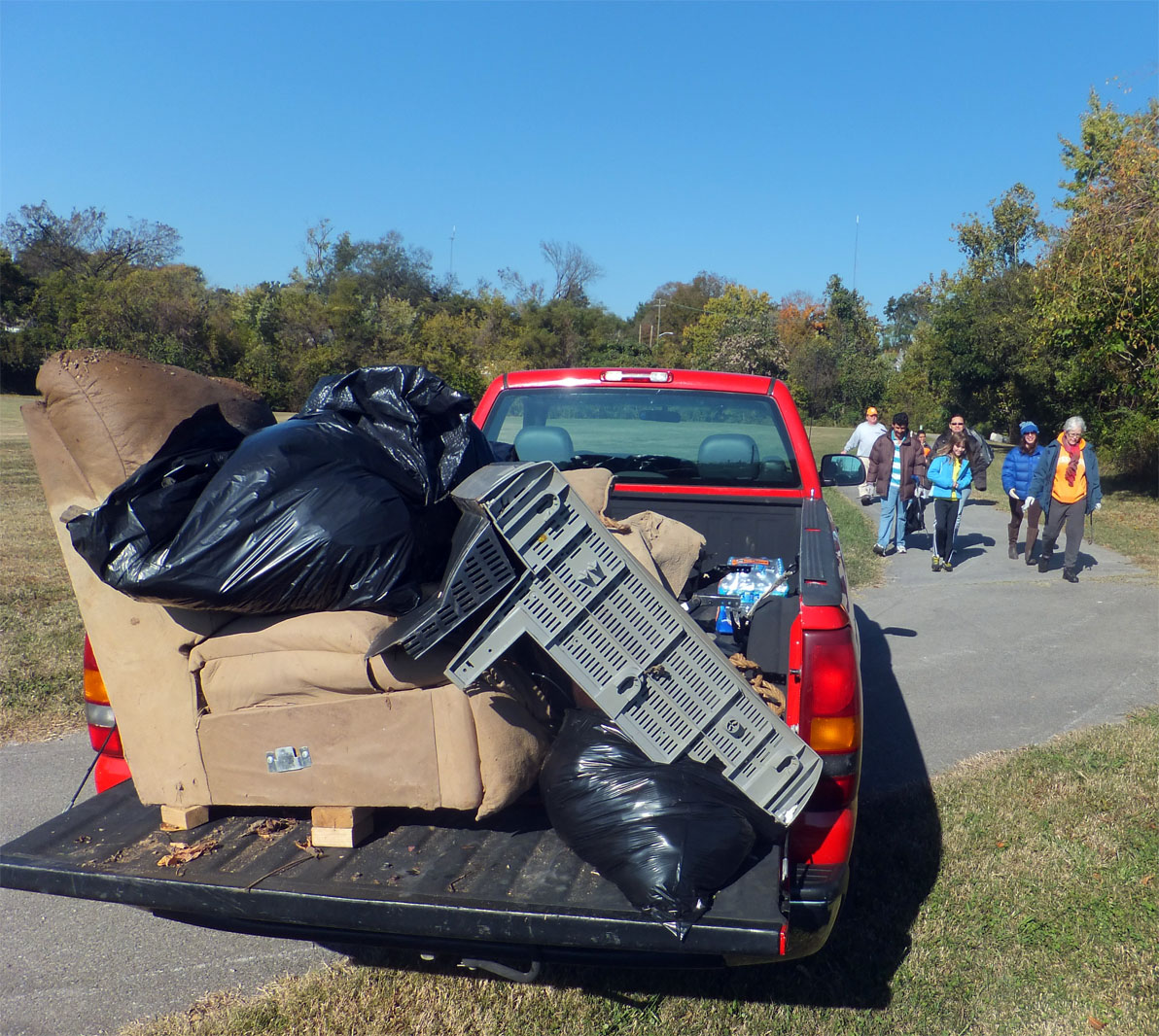 Twelve trash bags and what do you get? Another day over and another First Creek Greenway cleanup. This one on Saturday, October 26, 2013. In addition to trash, as always there were interesting finds that included part of television (the type with a picture tube in it), two cooking grills (I guess summer was over and there was no place to store them except down at the creek.) part of a bicycle (Tires not included.), three shopping carts (Seems the creak can never get enough of these.), a Tennessee license plate from the 1980s (Car not attached.) and a sofa (The perfect thing to sit on and contemplate nature down at the greenway). Thank you to Martin Vargas, Greg and Christopher Brown, Mark and Samuel Shoemaker, Elizabeth, J. Carmen, Jonathan, and Nathan Garcia all of Cub Scout pack 146. Thank you, also, to Brad, Joy, Charis, and Cai Guildford, Diana Ray, Ron, Jennifer, Henry, and Dovie Lubke, Lauren, Fin, and Hagen Rider, Hazel Tippo, Beth, Lauren, and David Booker.A special thanks to the city of Knoxville and Keep Knoxville Beautiful for providing bags, gloves, water, and clean up equipment — including a dumpster to put all the trash in. Also, thank you to Magpies Bakery and Three Rivers Market. Magpies provided six dozen delicious mini-cupcakes and Three Rivers provided dozens of delicious Gala and Honeycrisp apples, perfect eating for a frosty fall morning.