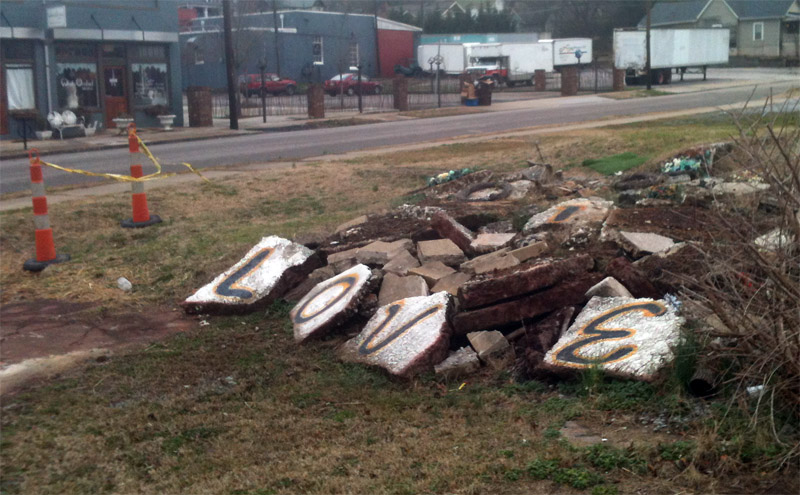 The scissors of the Chop Shop in the foreground and the Rx of the Relix Variety Theater in the background, a venue for music, comedy, and the Knoxville Horror Movie Festival.